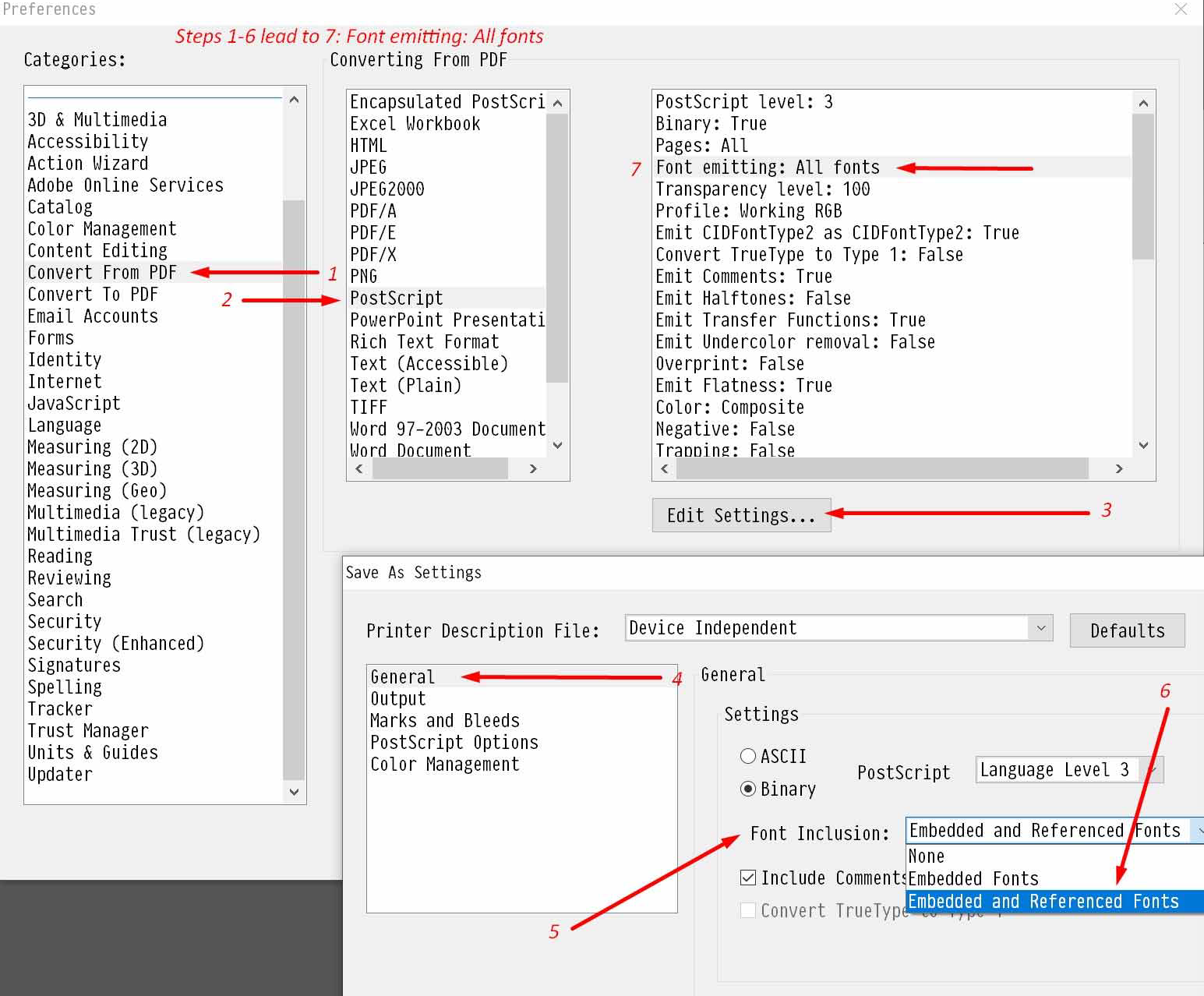 Include all fonts during embedding. In the Encapsulated PostScript drop down menu Font inclusion > Embedded and Referenced Fonts, Uncheck Convert TrueType to Type 1: