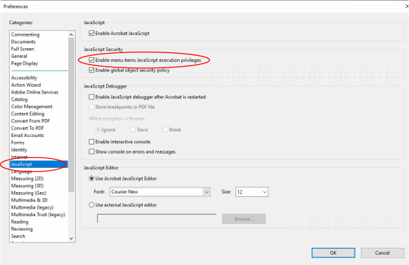 JavaScript > JavaScript Security > Check Enable menu items JavaScript execution privileges.