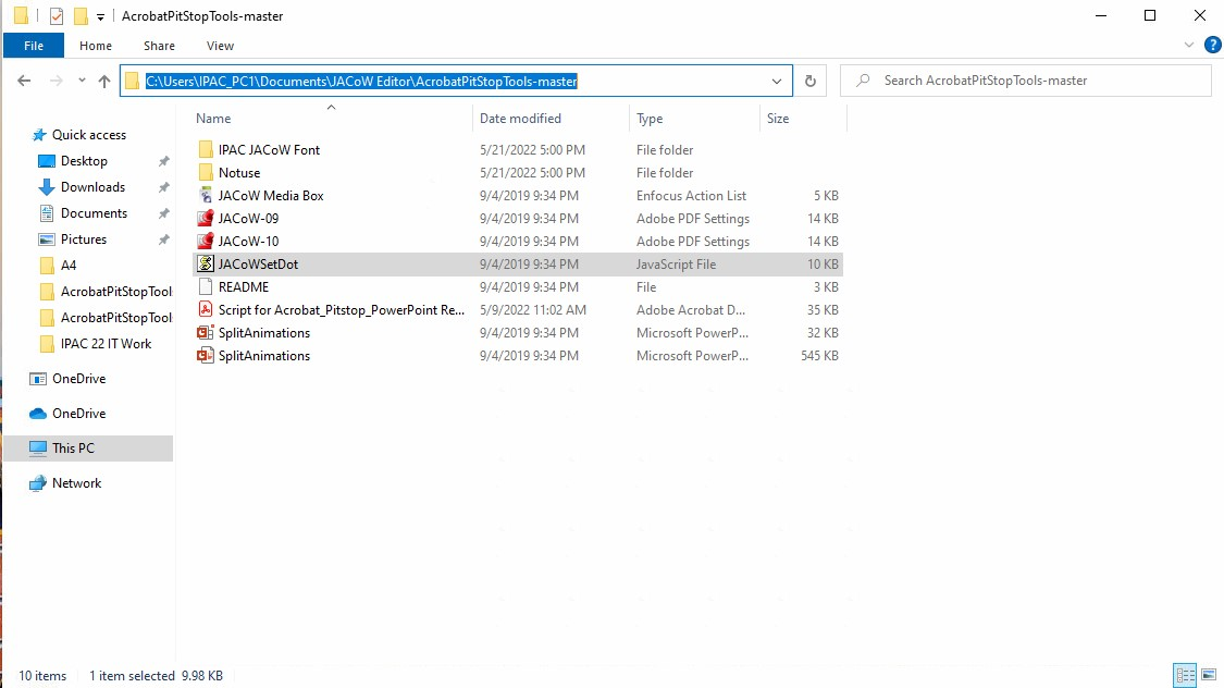 Place Dotting Script into the Acrobat JavaScript directory. Note that the directory will be named the same as the version of acrobat you are using and may vary among different operating systems. For the latest Acrobat DC on Windows it should be: